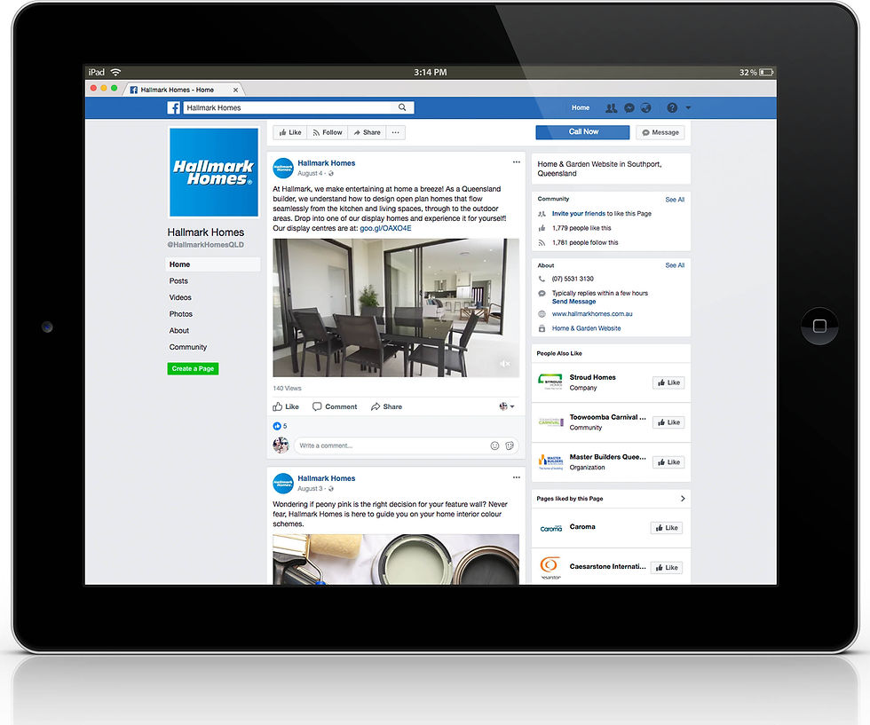 Hallmark Homes is a family-owned builder business in south east Queensland. Their brief was to create and manage an ongoing Facebook, Instagram and Pinterest campaign to increase traction with their online community. By creating interesting, consistent and original content (written, image and video) and sharing relevant blogs we managed to increase Hallmark’s following and get far more click throughs and conversions than ever before.